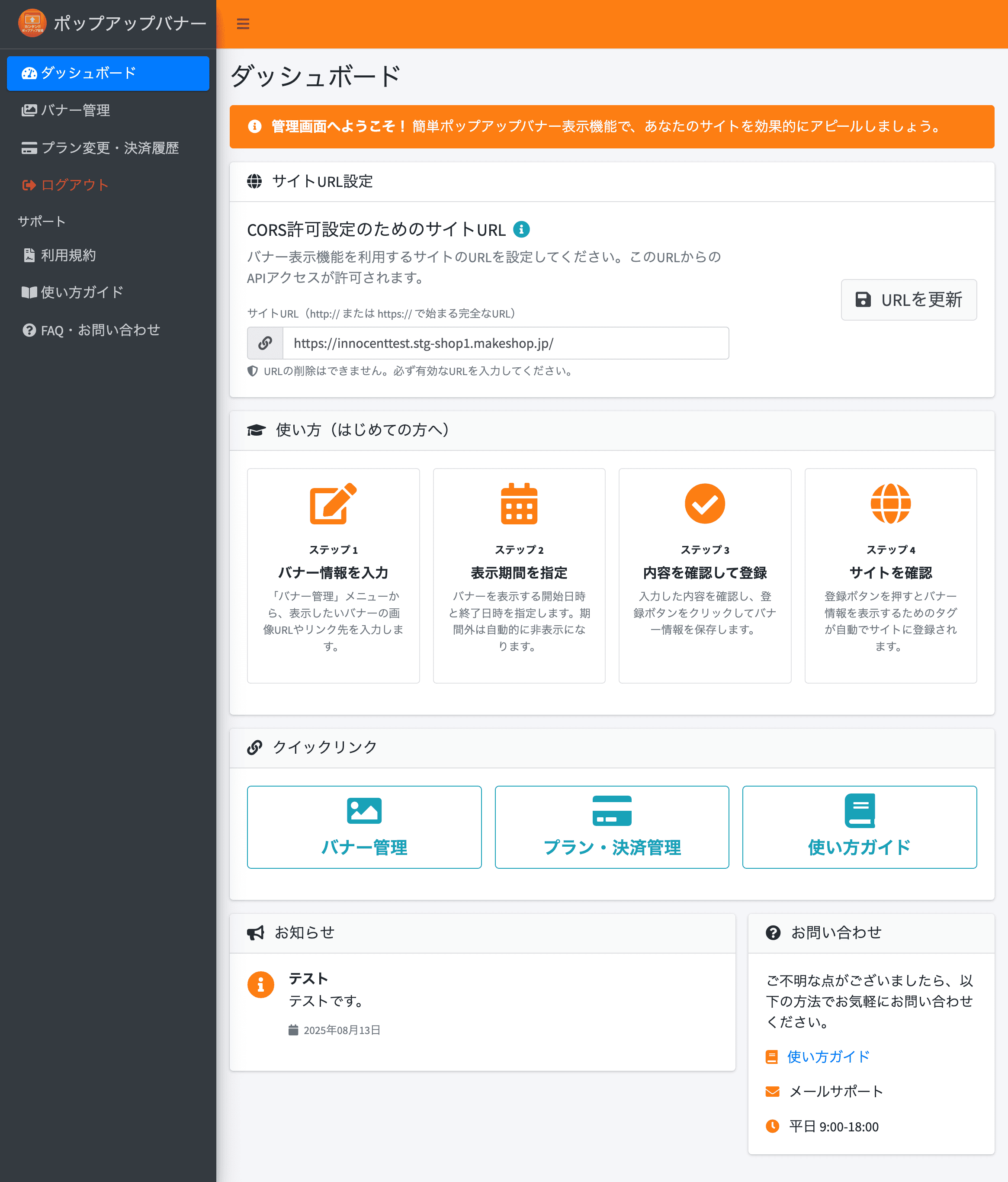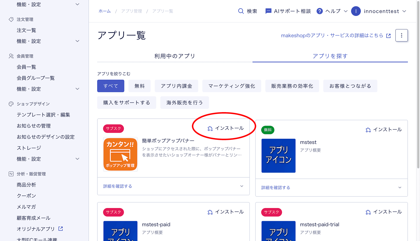 makeshopの管理画面にログイン後、メニュー>「アプリ一覧」より「簡単ポップアップバナー」を選択し、「インストール」ボタンをクリックしてください。