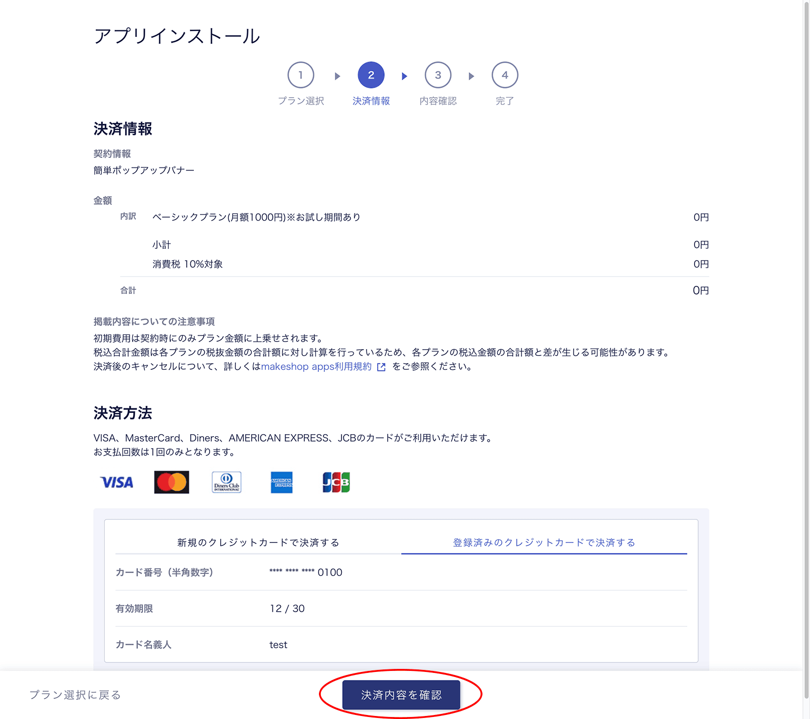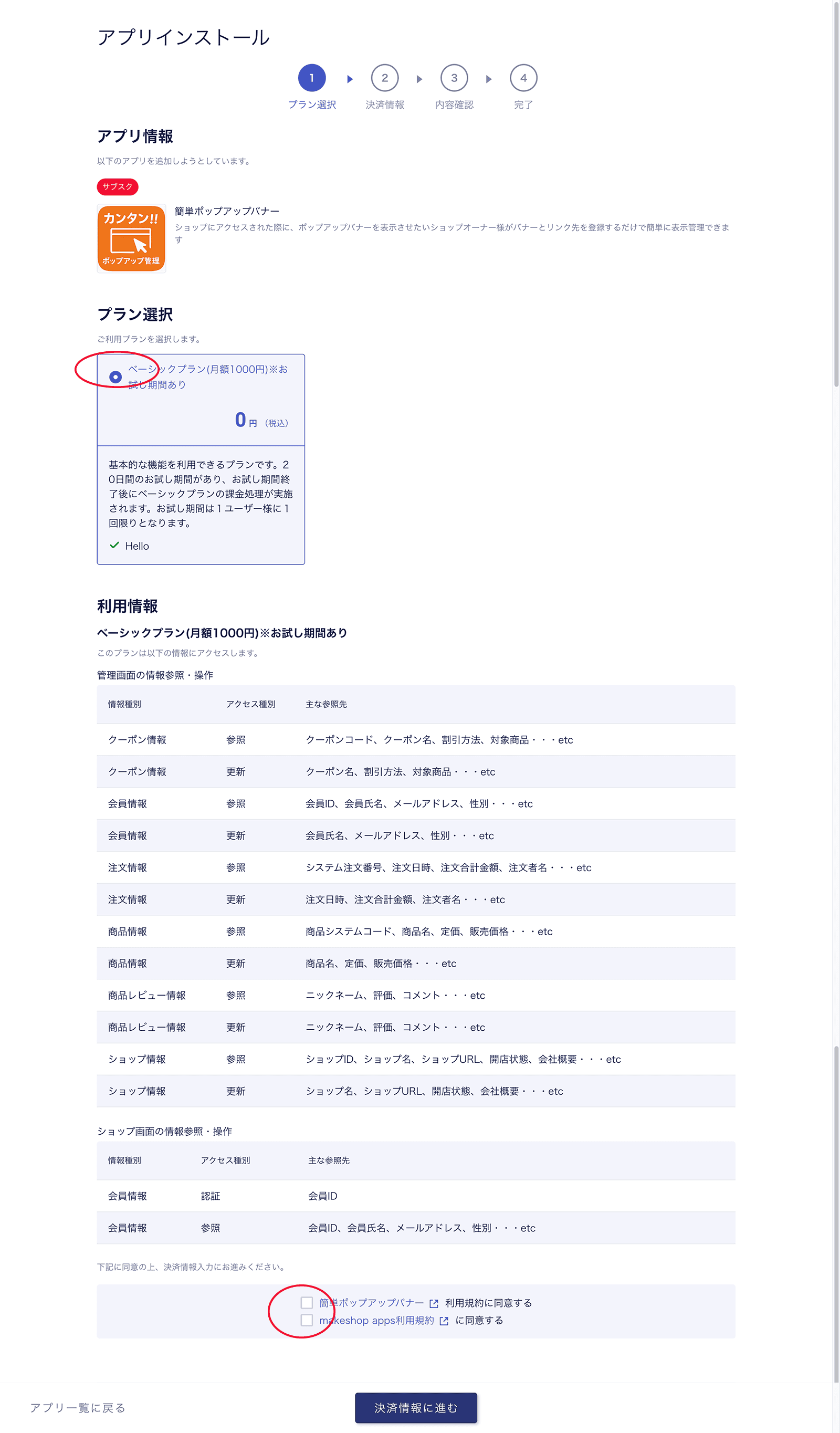次にページ下部にある2つの利用規約をご確認の上、「簡単ポップアップバナー 利用規約に同意する」「makeshop apps 利用規約に同意する」にチェックをいれ、「決済情報に進む」ボタンをクリックしてください。