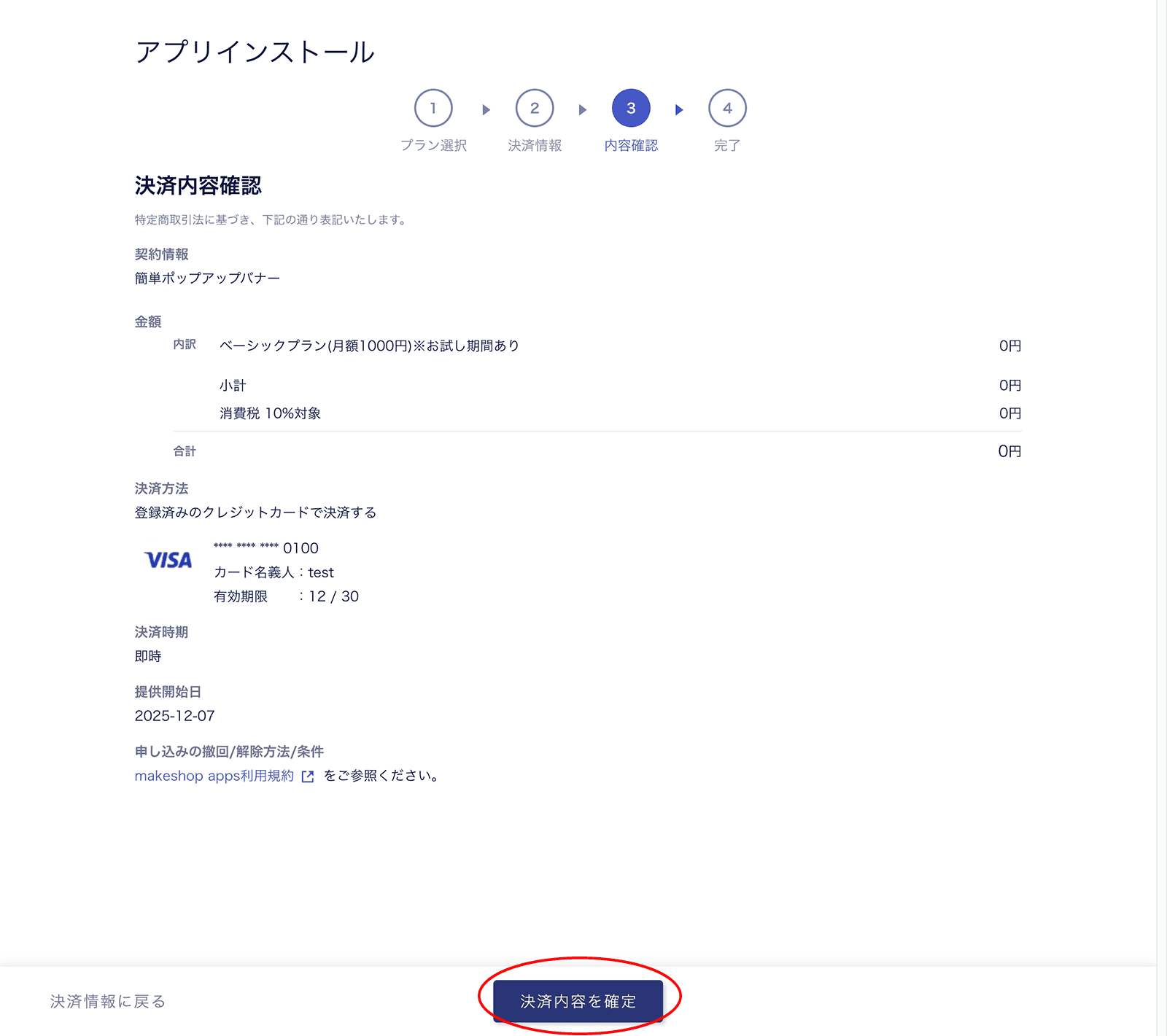 「決済内容を確定」をクリックしてください。これでインストールは完了です。