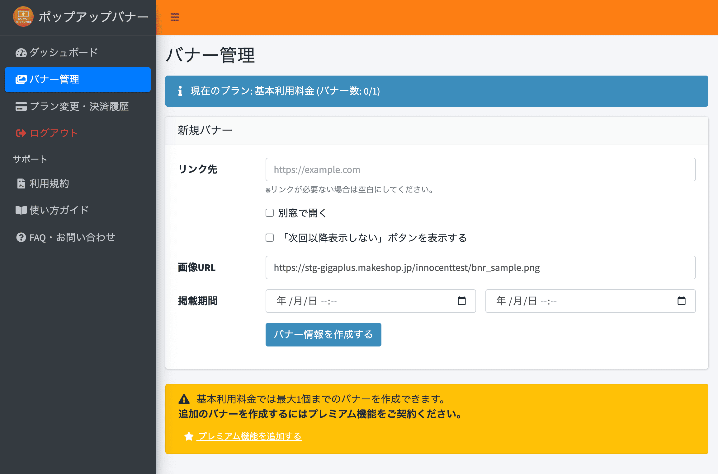 リンク先、画像URL(gigaplusで登録した画像のURL)、掲載期間を入力し、「バナー情報を更新する」ボタンをクリックしてください。